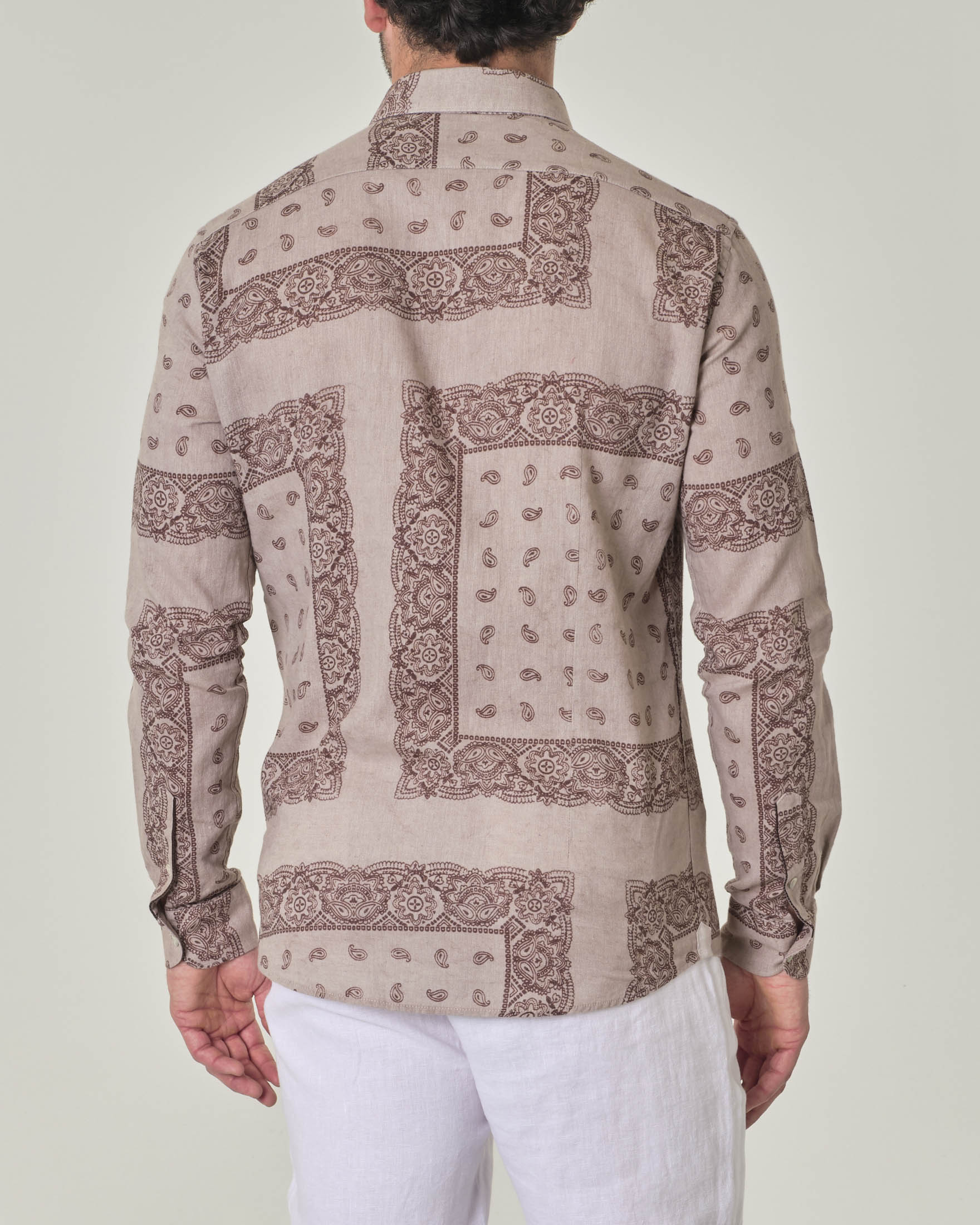 Camicia beige in lino e cotone a fantasia bandana bordeaux con colletto alla francese Very well made.
